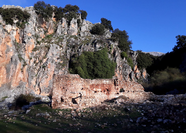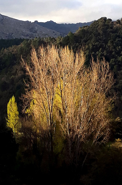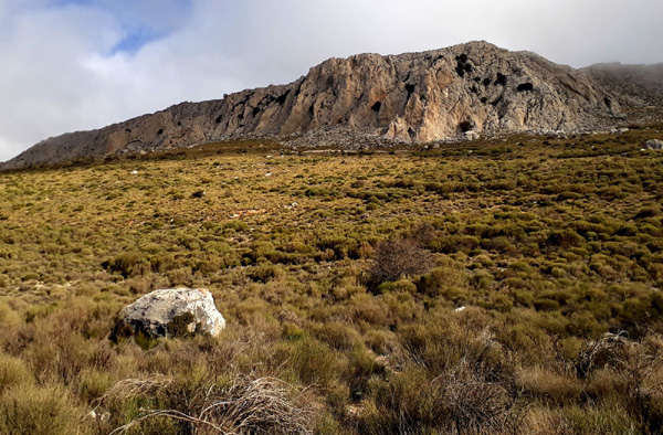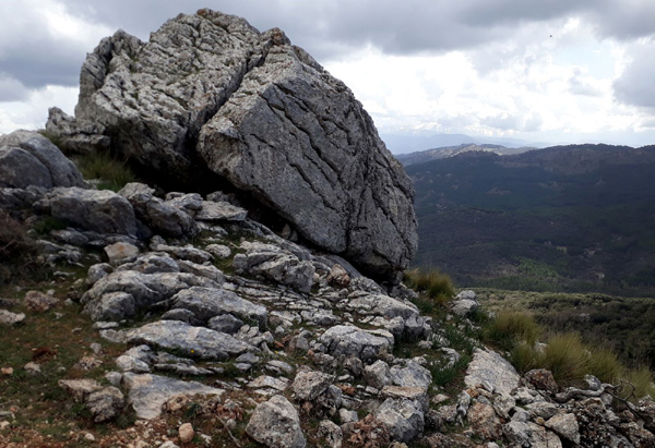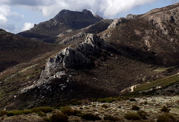 | Je reprends de la hauteur, splendide vue sur l'imposant Peñón de la Cruz que je viens de dévaler |