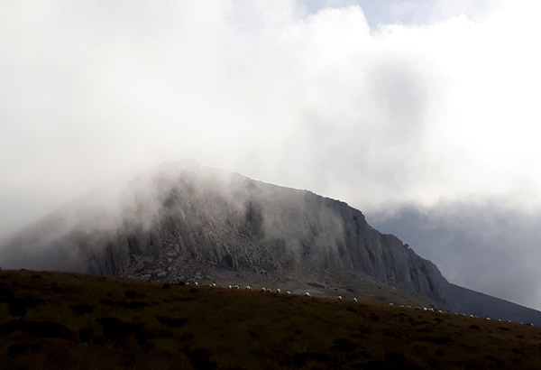 | Les nuages restent accrochés aux cimes, le temps s'éclaircit dans la descente |
