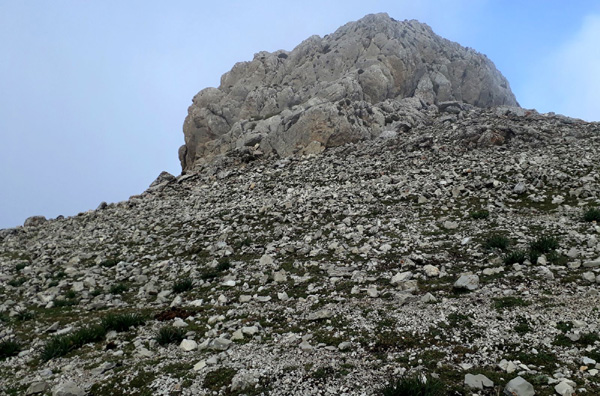| Descente abrupte et périlleuse (pierriers) L'avantage de l'épais brouillard est qu'il permet de ne pas voir le danger... |