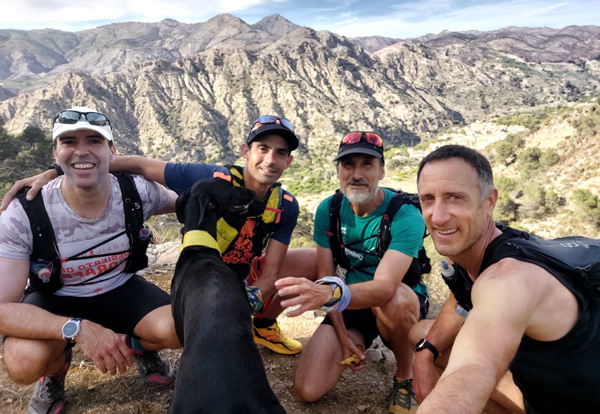 | Dimanche 26 mars 2023, 8h30, 18°C, village de Guájar-Fondón à 95 km à l'Est de Málaga dans la province de Grenade David, Dani, Nico, son lévrier de chien Sonic et moi |