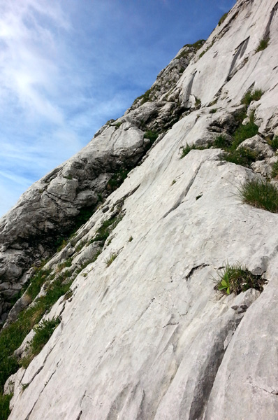 | Falaise de la Pointe d'Arcalod dont le sommet se dresse 450 m plus haut. L'ascension emprunte deux grandes failles inclinées séparées par des passages en traversée, techniquement de difficulté moyenne à condition d'être familiarisé avec le vide et de posséder quelques notions d'escalade... |