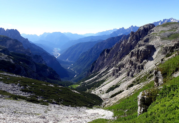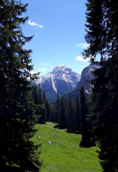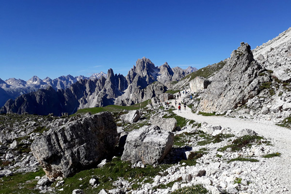 | KM 52 : derrière nous, les "Tre Cime di Lavaredo", sommets emblématiques des Dolomites, composés de la "Cima Grande" (2999 m), la plus élevée, la "Cima Ovest" (2973 m) et la "Cima Piccola" (2857 m) |