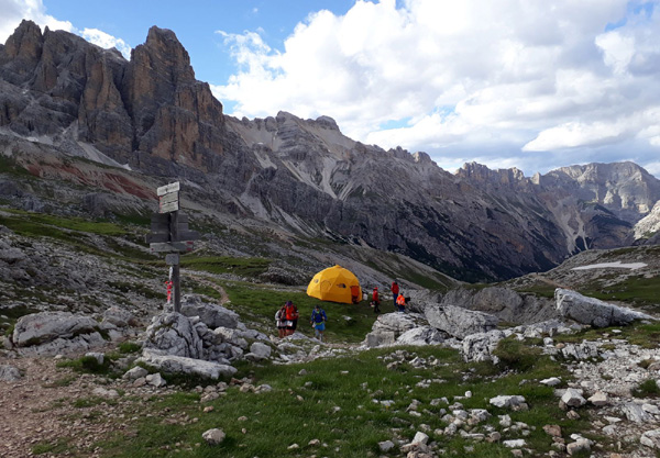 | KM 48 : après un ravitaillement au refuge Auronzo, encouragés par un groupe de randonneurs, nous continuons notre ascension vers le point culminant de la course (2460 m) |