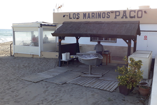 | Fruits de mers et cervezas au Chiringuito Los Marinos Paco sur la plage de Carvajal à Fuengirola, longée par le Paseo Marítimo Rey de España |