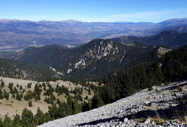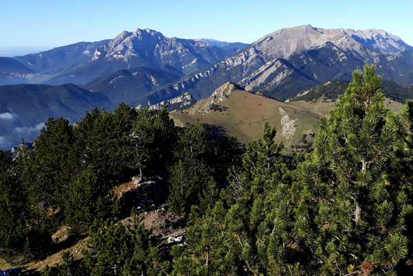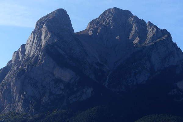 | Vue imprenable sur le massif du Pedraforca (2507 m d'altitude), montagne emblématique de la Catalogne à la forme particulière, formée par deux crêtes parallèles reliées au milieu par un col, l'Enforcadura. |