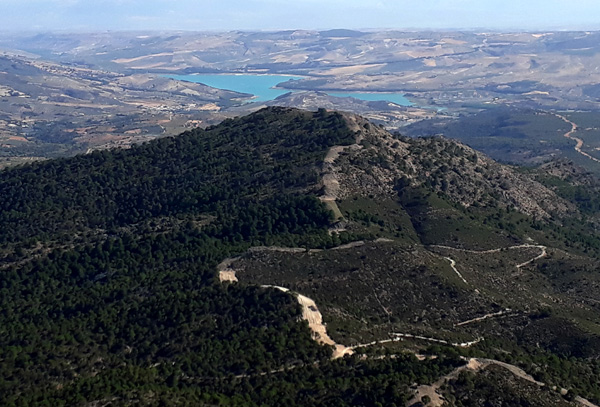 | En arrière-plan, le Pic del Cisne (1486 m), surnommé le "K2 andalou" en raison de son ressemblance avec le K2 (8611 m), deuxième sommet le plus haut du monde situé sur la frontière sino-pakistanaise. |