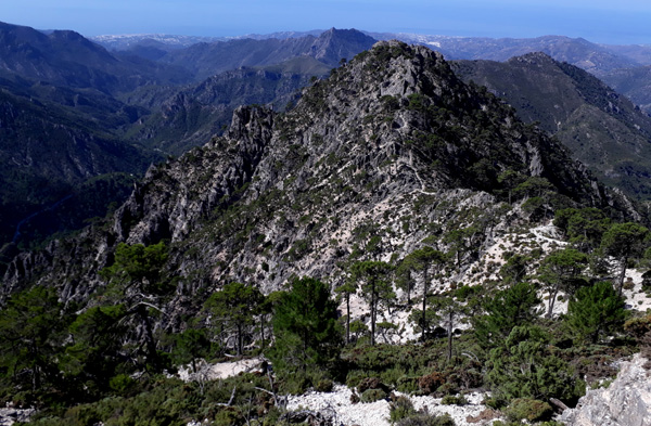 | Pic del Lucero ou Raspón de los Moriscos (1779 m), quatrième sommet le plus haut sommet de la province de Malaga. Ruine d'un ancien poste de la Guardia Civil espagnole (Gendarmerie) construit dans les années 1940 pour contrôler la résistance au franquisme dans les maquis. Le poste de garde restant illuminé la nuit, le pic fut baptisé El Lucero ("L'étoile"), bien que son véritable nom soit El Raspón de los Moriscos ("L'Egratignure des Maures"), dénomination en relation avec les rébellions qui eurent lieu au 16ème siècle en Axarquía. |