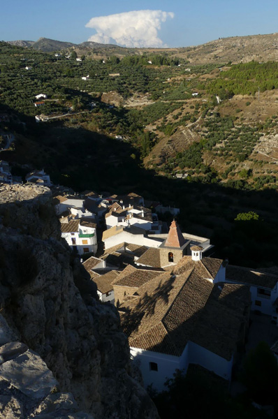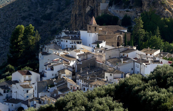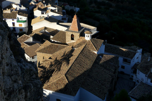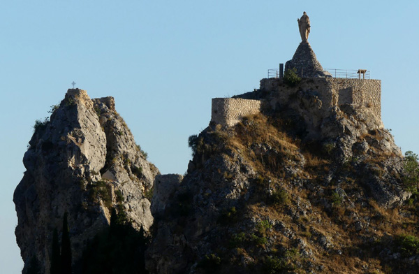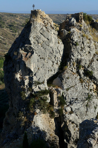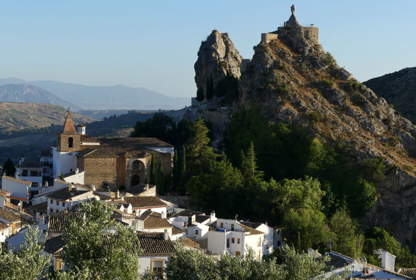 | La Peña de Castril, rocher d'une centaine de mètres de hauteur, assis sur la rive gauche du Río Castril et sur lequel les restes d'un château du 11ème siècle et une statue du Christ dominent le village. |