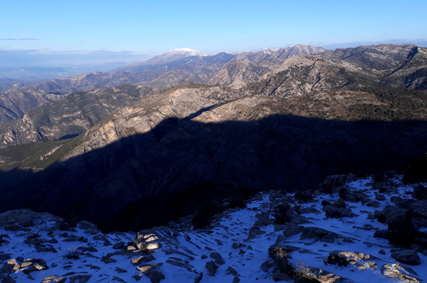 | Au loin, le Pic de la Maroma avec son bonnet blanc |