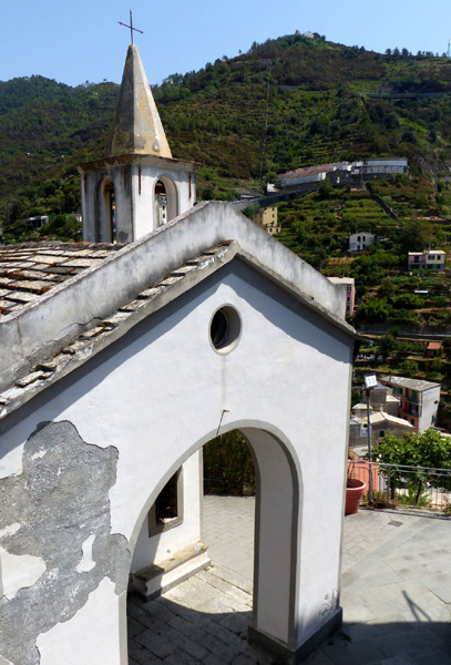 | Basilique de San Giovanni Battista, en haut du centre historique de Riomaggiore. Elle fut construite en 1340 par les maîtres Antelami à la demande de l'évêque du diocèse de Luni, Antonio Fieschi. A la suite d'un éboulement, l'église fut complètement reconstruite en 1870-1871. |