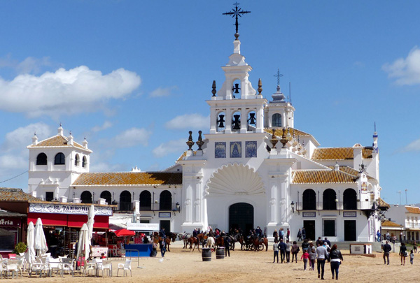 | El Rocío, en bordure du Parc national de Doñana, a gardé un aspect très particulier où la modernité n'a pas sa place et qui n'est pas sans rappeler l'Ouest américain de la fin du 19ème siècle. Les rues sont de terre et de sable, aucune n'est pavée ou asphaltée. Les habitants se déplacent à cheval ou à pied. L'église de la Vierge del Rocío, achevée en 1969, attire en pèlerinage chaque année à la pentecôte un million de fidèles. |
