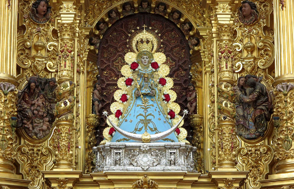 | L'apparition de la Vierge de El Rocío remonte 16ème siècle. Un berger (ou un chasseur, selon les versions) du nom de Gregorio Medina, trouva au lieu-dit La Rocina, dans une cavité d'un arbre, une statuette de la Vierge et décida de l'emmener avec lui à Almonte, le village le plus proche, à 17 km de là. Sur le chemin, il se reposa un instant et, à son réveil, la statuette avait disparu. Il retourna alors à l'endroit où il l'avait découverte et la retrouva au même endroit. Quand il raconta son aventure aux autorités d'Almonte, ces dernières en conclurent que la statuette y était retournée de sa propre volonté et que cet endroit était le sien. Ils décidèrent d'ériger un ermitage à cet endroit pour son adoration. La Vierge prit le nom de Virgen de Las Rocinas, puis de Vierge del Rocío en 1758. |