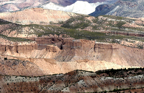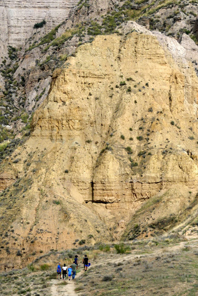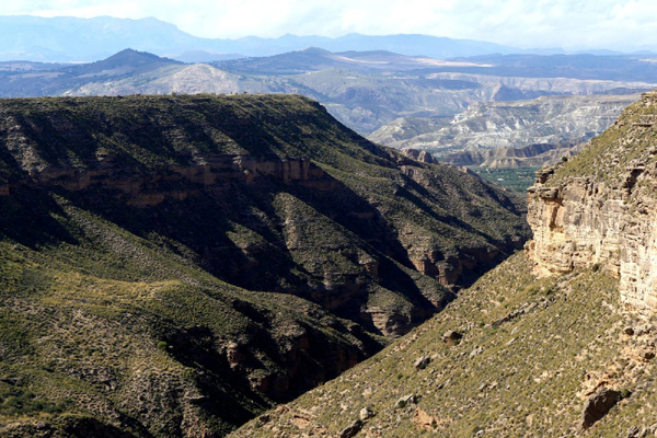 | Sur le plateau surplombant Gorafe, surfant le long d'une crête à flanc de colline, une route cahoteuse offre un stupéfiant paysage de montagnes plissées, de canyons, de ravines et de pinacles évoquant de gigantesques vagues pétrifiées à perte de vue... Le désert de Gorafe, zone de "badlands" ("mauvaises terres") sculptée par l'érosion exhibe des teintes rouges, ocres ou jaunes en fonction des roches et de la lumière, qui lui valent le surnom de "Los Colorados". |