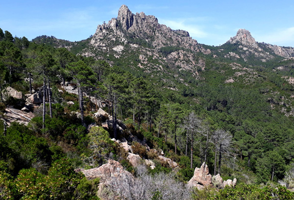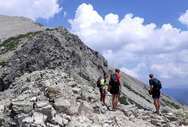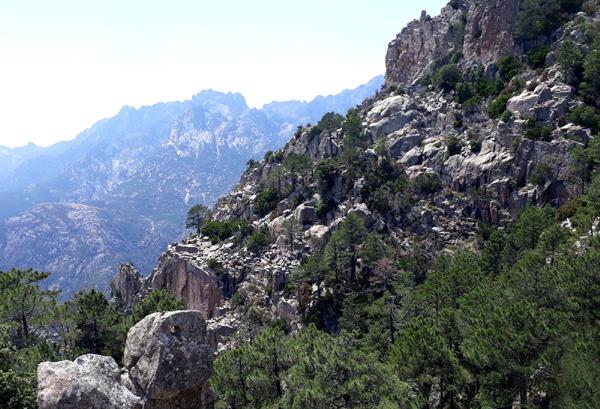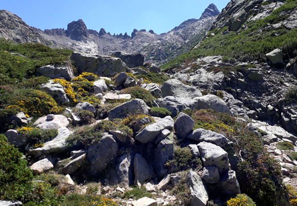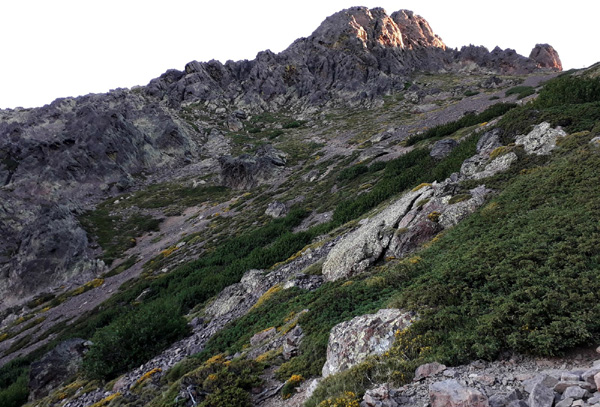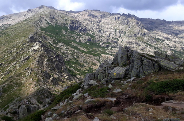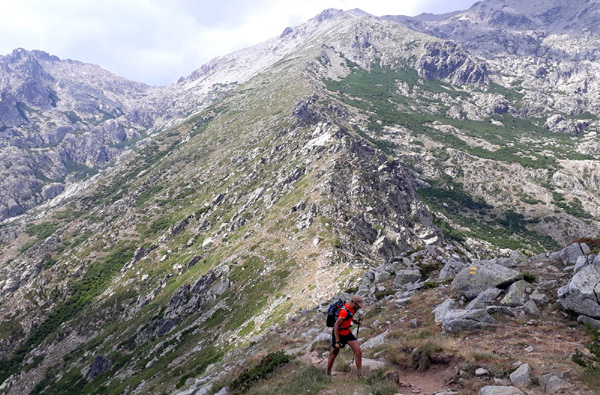 | En marche vers la Pointe de Eboulis (2607 m)... En haut à gauche de la photo : le Mont Cinto (2706 m), point culminant de la Corse |