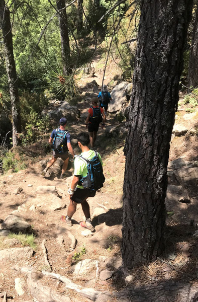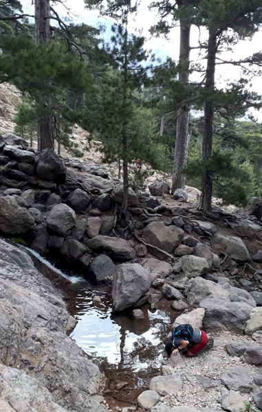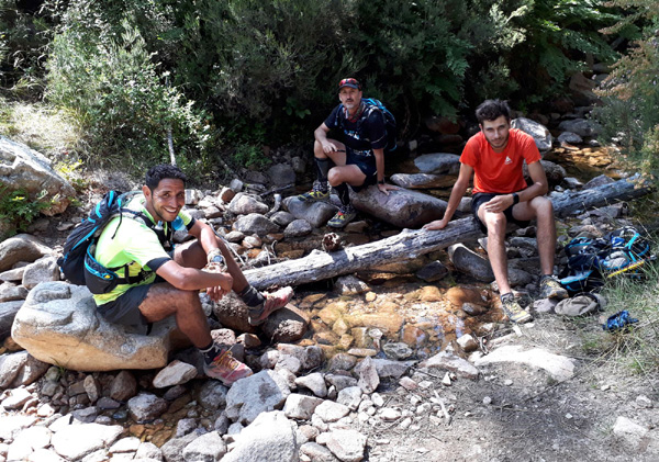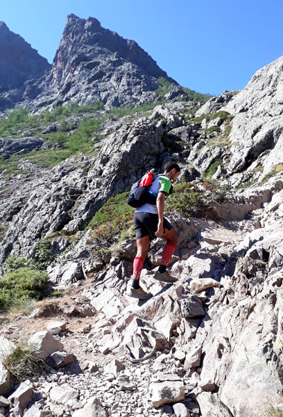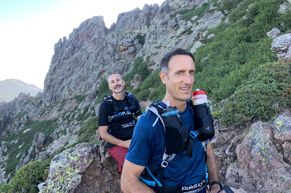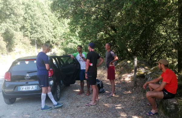 | Mardi 2 juillet, 5h30 : Antoine, trailer de 19 ans super performant sur les marathons de montagne, et son père Laurent, ancien légionnaire et sportif confirmé, quittent le village de Calenzana. Nicolas, M'hamed et moi les rejoindront le mercredi 3 juillet au soir à Castel Di Vergio, Antoine et Laurent ayant préféré réaliser notre 1ère étape en 2 jours. |