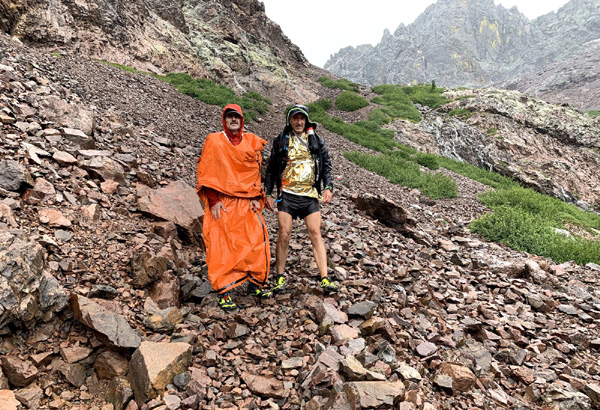| Surpris en pleine ascension par un violent orage et un déluge de grêle, nous trouverons un abri de fortune derrière un bloc de pierre. 15 minutes interminables, la foudre à moins de 50 m, hypothermie générale malgré nos couvertures de survie... et aucune autre solution que d'attendre que les éléments s'apaisent. La météo des montagnes n'avait pas prévu cet épisode aussi soudain qu'isolé. |