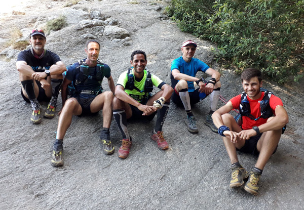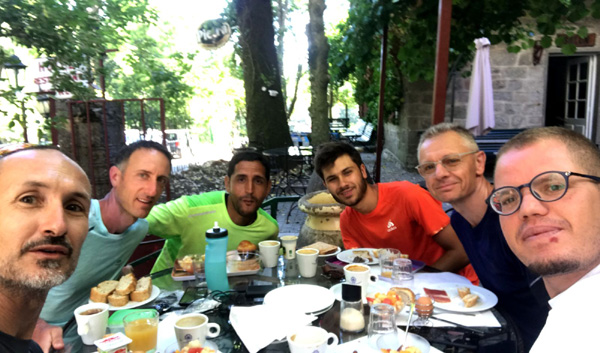 | Jeudi 4 juillet, 6h30 : départ de Castel Di Vergio, le Club des 5 au complet ! De gauche à droite : Laurent, M'Hamed, Nico, moi et Antoine |