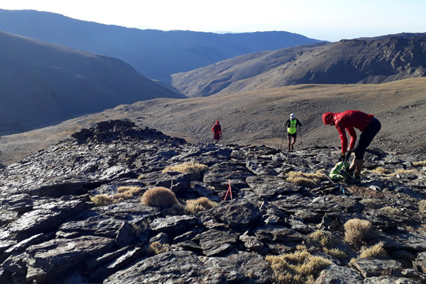 | Ne pouvant plus revenir sur nos pas et n'ayant pas réussi à trouver une sortie par le haut, nous décidons de tenter une sortie par le bas, dans l'espoir de rejoindre le Barranco de Estrella que David et moi avons déjà emprunté, puis de monter directement au Pic Mulhacén (3478 m). |