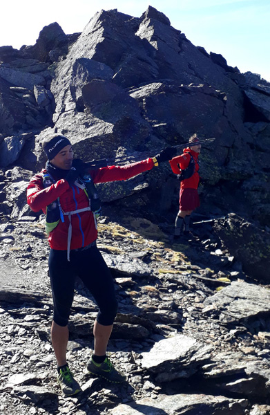 | 11h20. A cet instant précis, tout allait encore bien... 5h50 d'ascension, 1960 m de dénivelé positif et 19 km déjà parcourus, les plus durs de la traversée. 30 mn plus tard, la trace GPS que nous suivons débouche sur un chaos de rocs et de pierres instables et des pentes vertigineuses. L'ultra-trailer qui a partagé cet itinéraire a réalisé sa course en 2017. Il semble que son signal GPS ait décroché sur plusieurs centaines de mètres à cet endroit et qu'il y ait eu un important éboulement en 2019, rendant cette zone impraticable. |