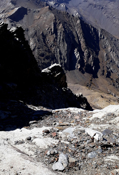 | Nous quittons le confort de notre crête et plongeons dans la face nord, sombre, escarpée et inhospitalière... |