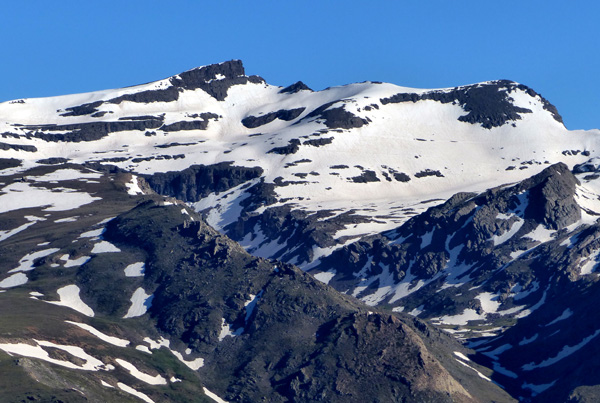 | Pic Veleta (3396 m), facilement identifiable par sa forme trapézoïdale |