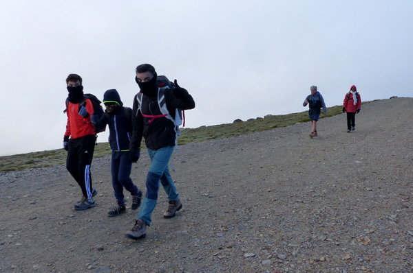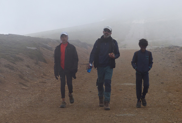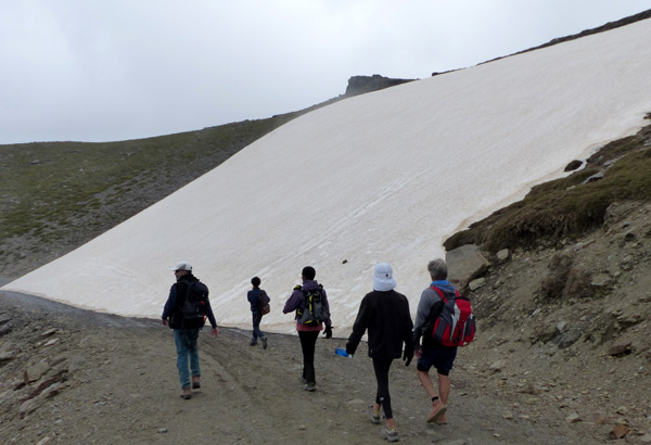 | 2520 m d'altitude et un vent glacé en guise de bienvenue... Miguel, Ferdinand et José ouvrent la marche, suivis par Jean-Pierre et Lydia |
