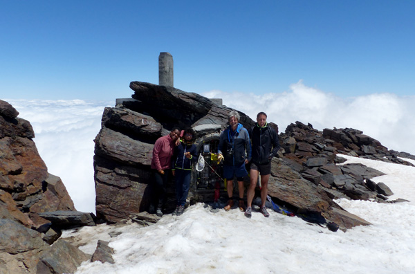 | Jean-Pierre et Lydia nous rejoindrons 20 mn plus tard, puis Miguel. José, souffrant de tachycardie à 200 mètres du sommet, a préféré redescendre, nous faisant une belle frayeur au passage ! |