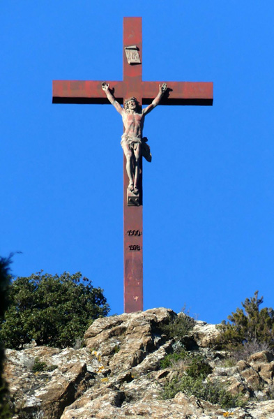 | Croix des Maures (437 m d'altitude), dressée par l'abbé Mathieu en 1900 sur les hauteurs de la Garde-Freinet. Le Christ pèse 175 kg. |