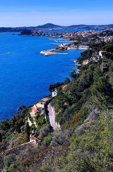 | Chemin de la Batterie Basse (premier plan), plages du Mourillon, quartiers du Mourillon et de la Mitre, Tour Royale, et, en arrière-plan, La Seyne-sur-Mer |