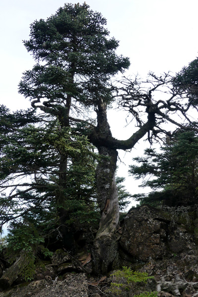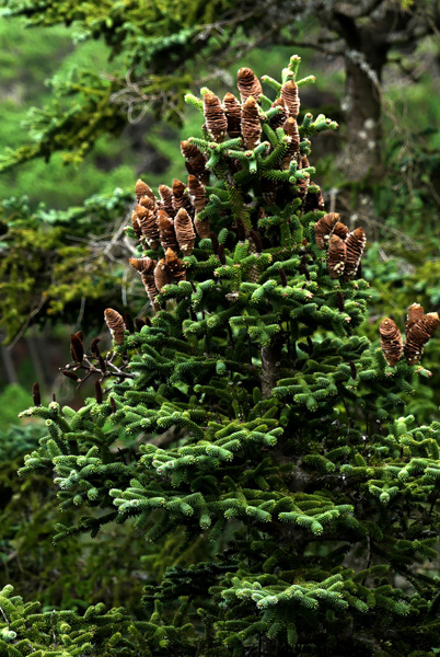 | Le "pinsapo" : sapin d'Andalousie pouvant atteindre 25 m de haut. Ses branches sont serrées et en forme de flèches. Ses aiguilles courtes, rigides et moins aplaties que celles de la plupart des sapins. |