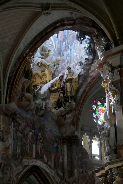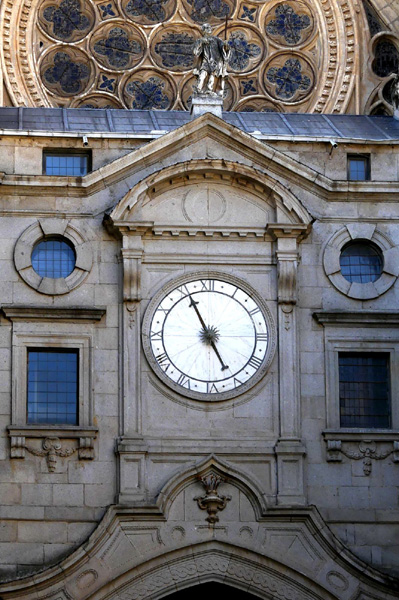 | Cathédrale Santa María, siège de l'archevêque de Tolède. L'édifice actuel fut bâti en style gothique à compter de 1226, à l'emplacement de l'ancienne grande mosquée de la cité. La cathédrale appartient au cercle des plus prestigieuses cathédrales espagnoles. Elle est classée sur la liste du patrimoine mondial de l'UNESCO depuis 1986. |