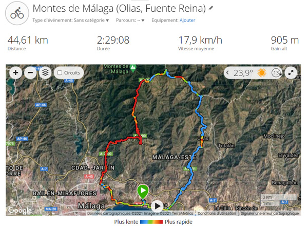 | MÁLAGA - OLÍAS - COL DE LA BOLINA (772 M) - COL DEL LEÓN (900 M) - FUENTE DE LA REINA - MÁLAGA 44,6 KM, 905 M de dénivelé positif / 2021 - ESPAGNE, Andalousie |