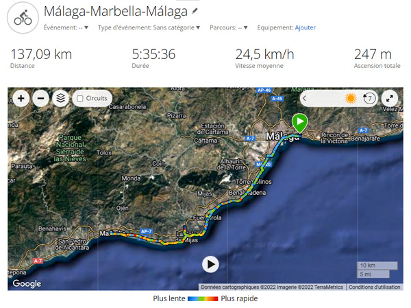 | MÁLAGA - MARBELLA - MÁLAGA 137,1 KM, 247 M de dénivelé positif / 2022 - ESPAGNE, Andalousie |