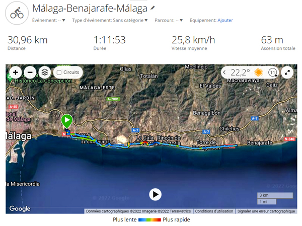 | MÁLAGA - BENAJARAFE - MÁLAGA 30,96 KM, 63 M de dénivelé positif / 2022 - ESPAGNE, Andalousie |