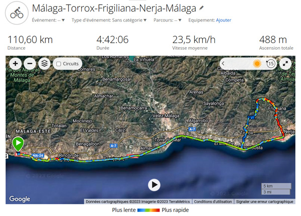 | MÁLAGA - TORROX COSTA - TORROX PUEBLO - FRIGILIANA - NERJA - MÁLAGA 110,6 KM, 488 M de dénivelé positif / 2023 - ESPAGNE, Andalousie |