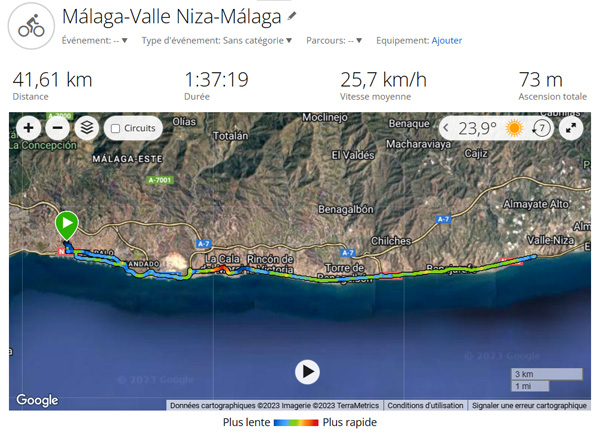 | MÁLAGA - VALLE NIZA - MÁLAGA 41,6 KM, 73 M de dénivelé positif / 2023 - ESPAGNE, Andalousie |