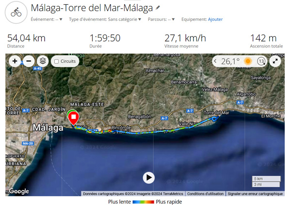 | Mercredi 10 juillet 2024, départ de Pedregalejo à 19h15, 28ºC | ||||||||